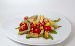 Nudeln abseihen und auskühlen lassen. Mit dem Gemüse gut vermischen, anschließend mit dem Dressing marinieren und ca. fünf Minuten ziehen lassen. Auf Tellern anrichten und mit Rucola und Parmesan bestreuen.