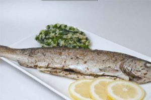 Fertige Forellen mit Zitronensaft beträufeln und zusammen mit dem Risotto anrichten.