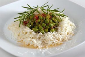 Reis mit Erbsensauce und frisch geriebenem Parmesan anrichten.
